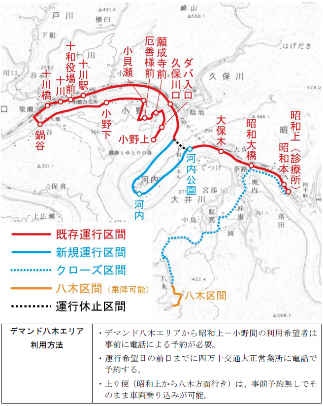 小野上~昭和上を運行しているコミュニティバス小野線について、路線バス「窪川~十和線」の再編に伴い、令和8年3月より河内地域を運行する経路に変更します。また、交通空白地である八木地区の移動手段確保のため、路線を八木地区へ延長しデマンド運行区間とします。